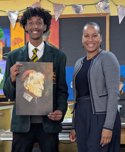 The visit concluded with a reception in the entrance gardens, where refreshments were served. Mr Dunne presented Her Royal Highness with special gifts from the school: a limited edition badge commemorating the Catholic Church’s Jubilee Year of Hope, designed by the Head of Art, Ms Sachelle Linton, and a portrait of St John Henry Newman, the school’s patron, by Year 10 student Osman Mohammed.